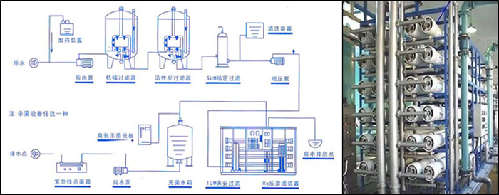预处理系统:一般包括原水泵、加药装置、石英砂过滤器、活性炭过滤器、精密过滤器等。其主要作用是降低原水的污染指数和余氯等其他杂质,达到反渗透的进水要求。预处理系统的设备配置应该根据原水的具体情况而定。