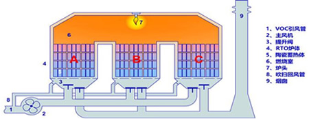 蓄热燃烧的原理是利用天然气(或柴油)直接燃烧加热有机废气,将有机废气在高温(750℃-900℃)作用下,使有机废气氧化成无机物(二氧化碳和水),最终实现有机废气达标排放。高温烟气通过陶瓷蓄热体时,将热量存于蓄热体用于预热进入RTO的有机废气,从而节省燃料,降低使用成本。