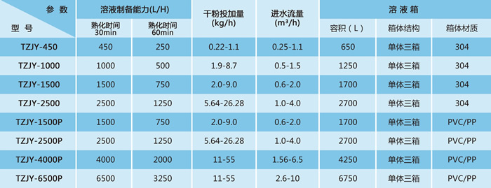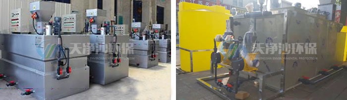 聚合物溶剂制备过程是通过各个溶液箱分级逐步处理完成的,溶液箱之间隔开,保证每个溶液箱内的最佳反应时间和恒定的浓度,避免在预制箱和最终溶液箱之间产生任何直接通路。该设备由控制箱自动控制,此控制箱与安装在最终溶液箱上的液位计相连,一旦液位达到“低位”,触发电动进水阀打开。触点式流量计就启动干投机,干投量的大小按照水量而定,以获取精确的浓度。一旦达到“高位”此循环过程就停止。当然两(或三个)搅拌器还在工作。该设备还用于将乳胶装的阳离子、阴离子或非离子型的聚合物连续自动的制成标准稀释浓度(0.3-0.5g/L)的溶液。尽管一般认为乳胶状的聚合物制成标准溶液所需的熟化时间大小预粉粒状聚合物。但是在将药耗达到最佳状态过程中总是推荐要充分的熟化时间。